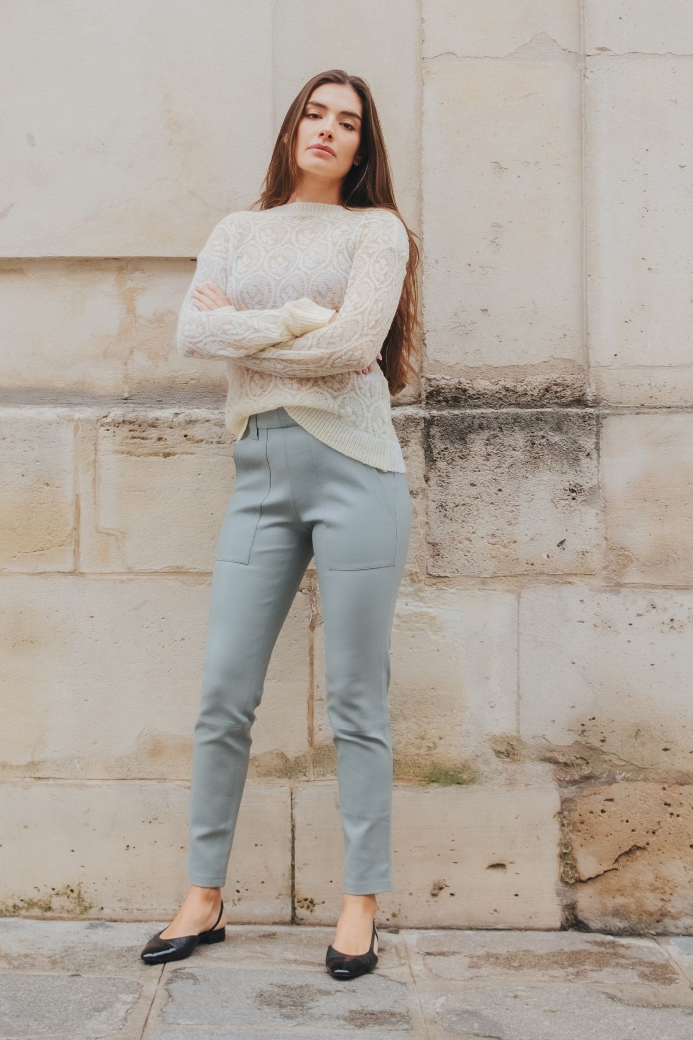 The Dayna Sweater is hand-knitted in Armenia from a soft wool and lurex yarn, creating a light, warm texture with a subtle shimmer.