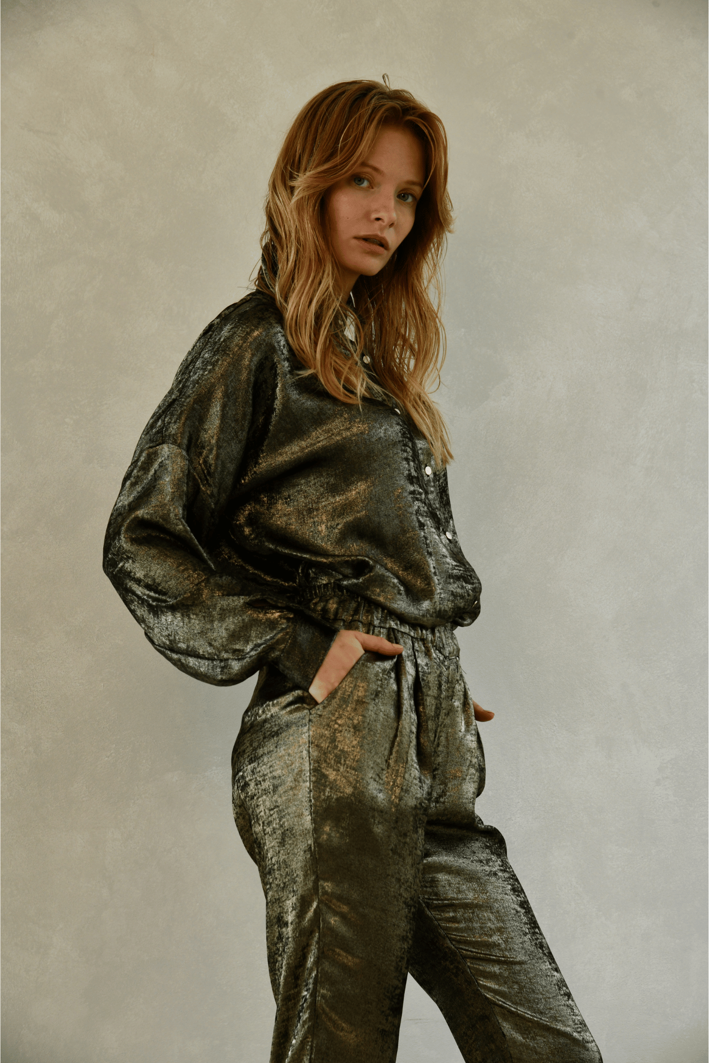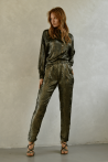 Ce pantalon doré fluide, à la coupe ajustée, allie confort et élégance.