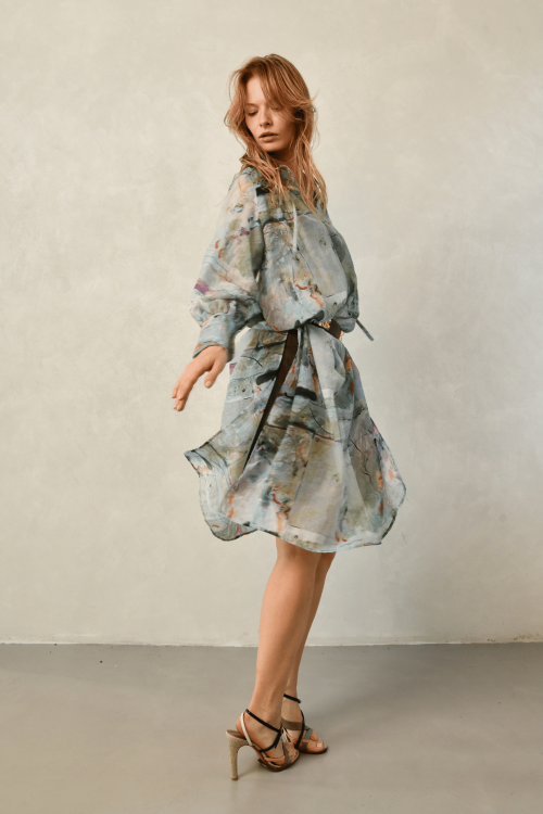 Découvrez l’alliance parfaite entre art et élégance avec notre robe fendue en soie et coton, ornée d’un imprimé exclusif inspiré d’un tableau peint par le père de la créatrice.