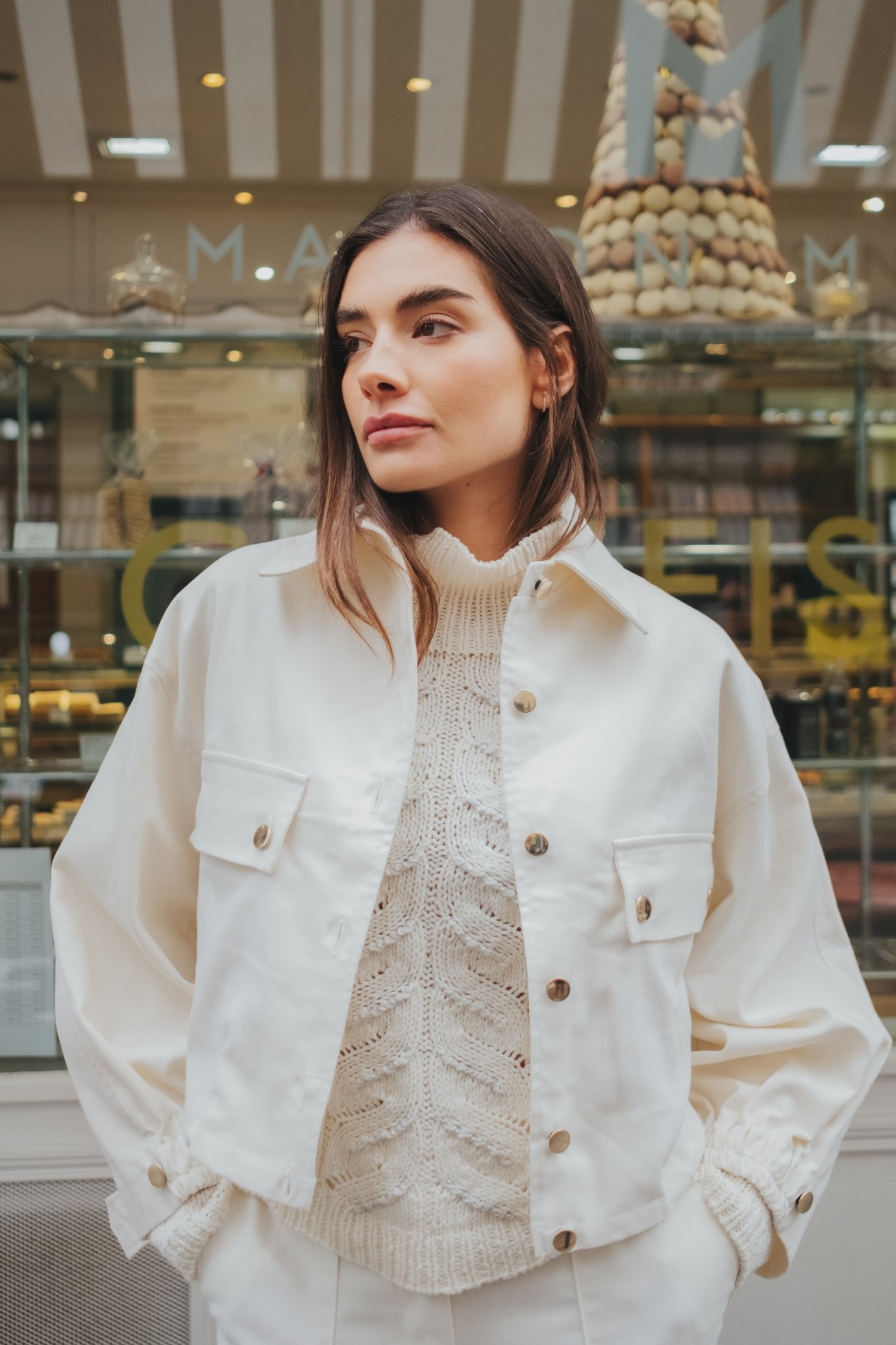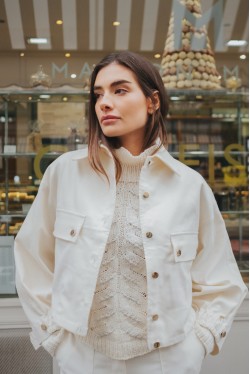 Les poches plaquées à rabat et les boutons dorés apportent une touche lumineuse et raffinée, tandis que les poignets élastiqués à smocks ajoutent confort et modernité. Les pattes décoratives boutonnées au poignet viennent parfaire les finitions de cette pièce d’exception.