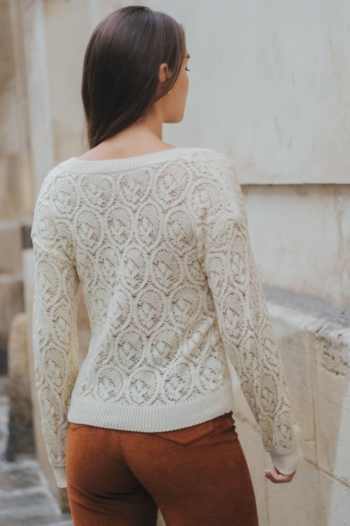 Sa maille ajourée façon dentelle et son col V dessinent une silhouette chic et cocooning, parfaite pour toutes les saisons.