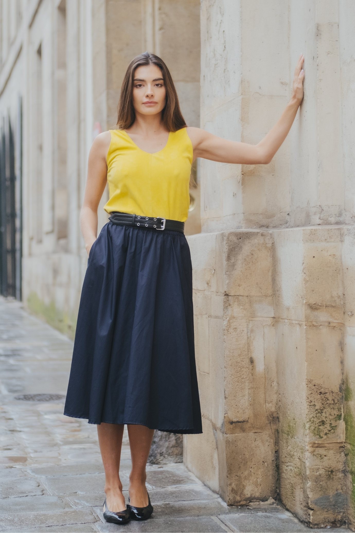 Sa longueur mi-mollet en fait une jupe intemporelle et polyvalente, idéale pour un look à la fois chic et décontracté.
