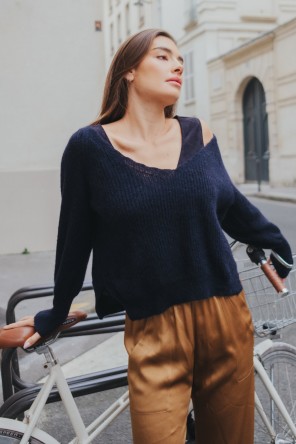 Porté à même la peau ou sur un débardeur, le pull Sabine s’impose comme une pièce essentielle du vestiaire : confortable, sensuel et intemporel.